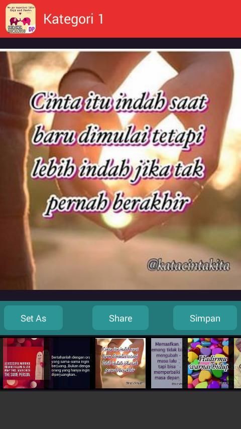 Миллионы бесплатных приложений для андроид представляются в 9apps. 20,000+ пользователи скачали последнюю версию Kata Kata Cinta Romantis в 9Apps бесплатно каждую неделю! Когда вы пользуетесь им, вы будете привлечены. Это горячее приложение было выпущено в 2016-12-15. Вам можно бестро получить его из 9Apps!