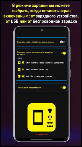 С помощью этой программы, вы можете настроить ваш телефон так, чтобы экран не выключался вообще никогда или не выключался при зарядке через USB, Qi (беспроводная зарядка) или АС (зарядное устройство).