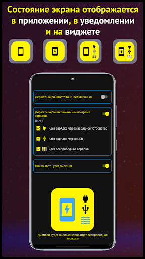 Держите экран включенным во время зарядки или постоянно. Иногда бывает необходимо держать экран телефона постоянно включенным, например во время езды или когда вы используете свой смартфон в качестве метеостанции. Это приложение позволяет настроить устройство так, чтобы дисплей не отключался. Например, если вы на работе держите телефон на беспроводной зарядке, то можете включить, чтобы экран не гас только во время беспроводной зарядке, а дома при зарядке через кабель, например, наоборот потухал. Или, чтобы в машине при зарядке через УСБ не потухала подсветка экрана.