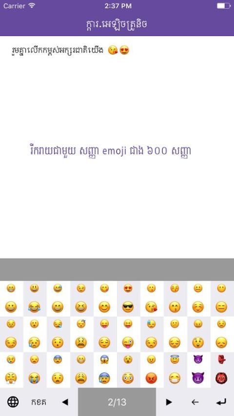 Кхмерский eKeyboard этого приложение, которое позволяет пользователям вводить текст кхмерского более проще и быстрее на их смартфоне и планшете. Приложение предназначено в целях увеличения использования кхмерского текста в любых областях, особенно в контексте социальной сети, как Facebook.
