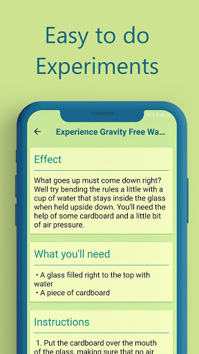 You’ll find a lot of experiments that could be done with simple ingredients that are easily available around your home (with adult supervision of course). Learn all the new physics concept with a step by step guided experiments with animation and instructions to explain you the science behind the experiments.