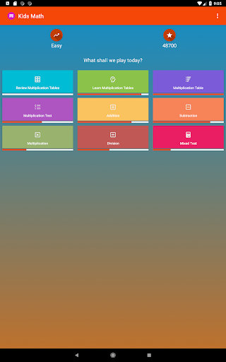 Узнайте таблицы умножения с графиками, тестами и практикой четырех основных операций в математике с нашим приложением Kids Math! Установите это приложение Math, чтобы позволить ребенку учиться и практиковать таблицы умножения, умножения и разделения, добавления и тесты вычитания, которые имеют три сложности для первичных студентов.