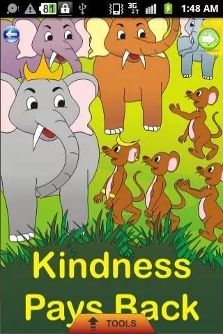 Король слонов поблагодарил короля мышей и людей его снова за их помощь. Мораль этой истории является "доброта всегда окупает."