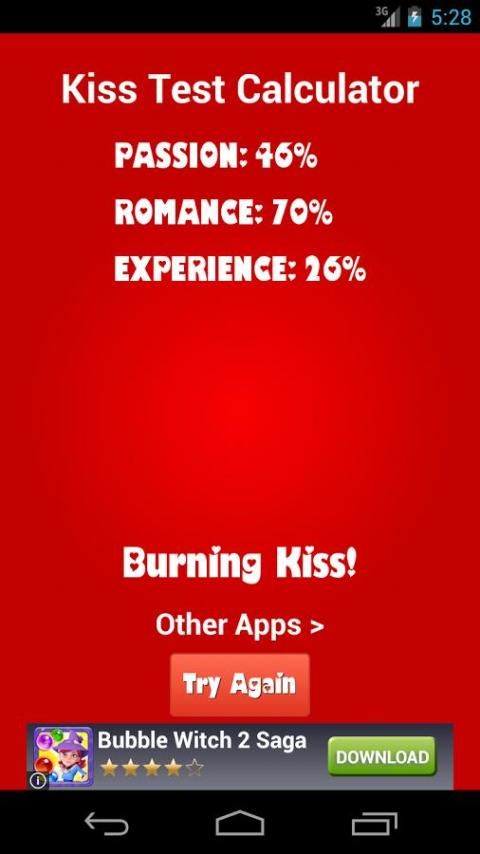 * Вы увидите процент, который измеряет вашу страсть, романтика и опыт поцелуи.