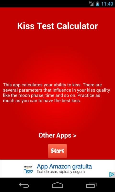 Поцелуй Тест Калькулятор это бесплатное приложение, что проверить свои способности, чтобы поцеловать. Это действительно весело и простой в использовании. Теперь вы можете узнать, если вы целуете как кинозвезда или ты целуешь, как лягушка. Это легко узнать, просто: