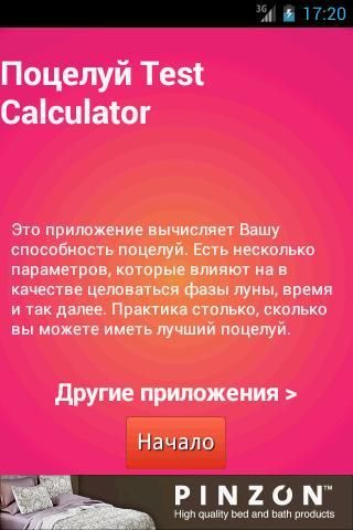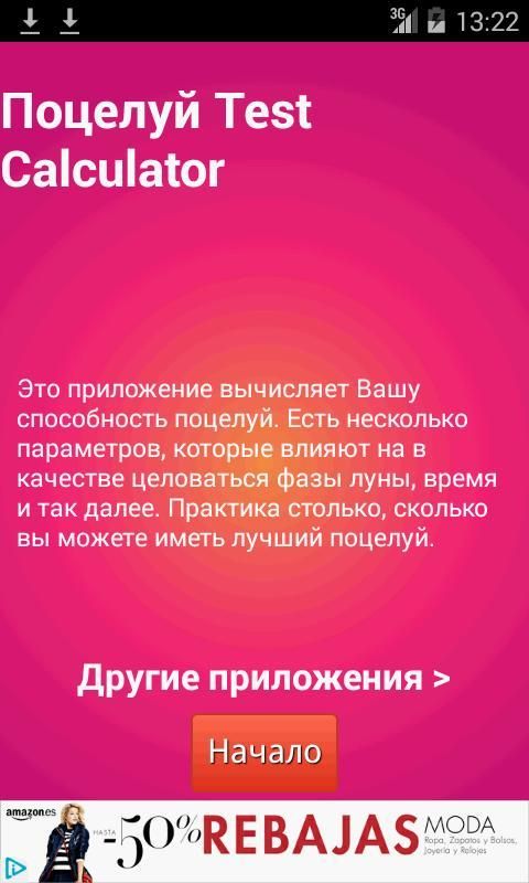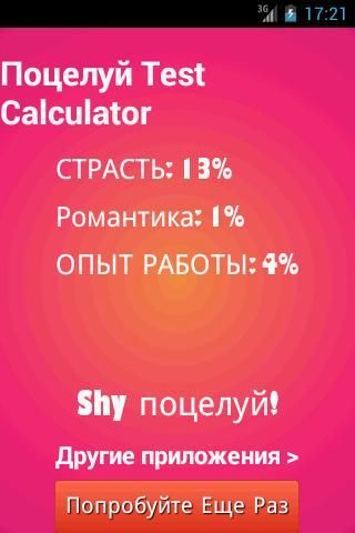 Поцелуй Тест Калькулятор это бесплатное приложение, что проверить свои способности, чтобы поцеловать. Это действительно весело и простой в использовании. Теперь вы можете узнать, если вы целуете как кинозвезда или ты целуешь, как лягушка. Это легко узнать, просто: