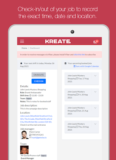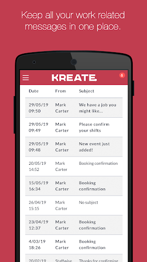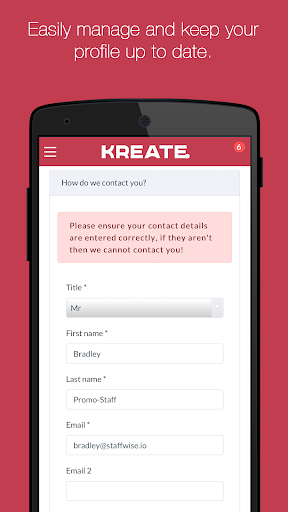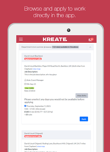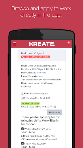 Ваш первый шаг - завершить нашу регистрацию.Процесс, заполнив форму по адресу https://kreate.staffed.it/registration.Вскоре после регистрации одной из нашей команды по подбору персонала будет непосредственно на связи, чтобы организовать интервью и дать вам инструкции о том, как загрузить приложение.Обратите внимание, что это может занять несколько недель после регистрации.Пожалуйста, позвольте нам обработать ваше приложение перед тем, как связаться с Kreate.Ваш любимый бренд.С помощью этого приложения вы можете регистрироваться и выходить на работу в каждой смене, а это означает, что эти ненужные телефонные звонки, чтобы подтвердить, что вы прибыли, исчезли навсегда.