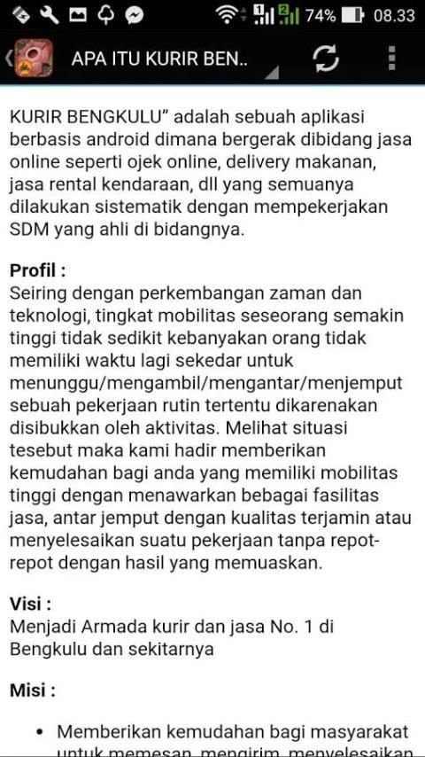 Наши услуги являются общими и универсальными, как курьеры и Ojeks обычно, но услуги, которые мы предоставляем здесь делается с помощью системы, стандартные правила, где службы конфиденциальность пользователей наша обязанность, качество обслуживания, поэтому мы высокого мнения и, конечно, с очень конкурентоспособной цене , К тому же за пределами услуги трансфера, отправлять и получать товары, которые мы также предоставляем интересную информацию о деловых возможностях, советы и рекомендации о том, как делать покупки дешево и легко все в приложении "КУРЬЕР Бенгкулу" есть.