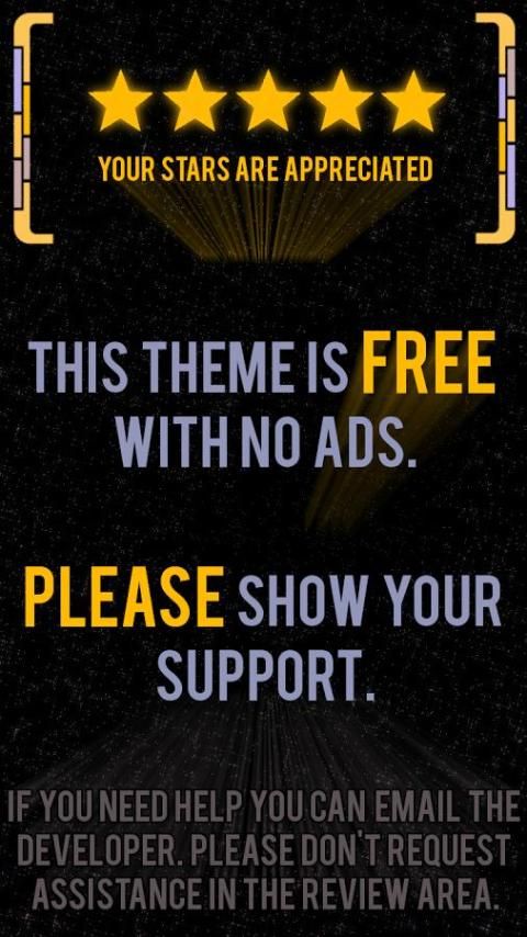 Там нет объявлений или разрешений на тему для GO Locker ... Для любителей Star Trek. Для того, чтобы сохранить это поощрение собираюсь пожалуйста, рассмотреть получение соответствующие темы и / или совпадающие живые обои. Если вы хотите поддержать соответствующие LCARS вдохновили темы для фанатов Star Trek, посетите веб-сайт разработчика или увидеть ниже.