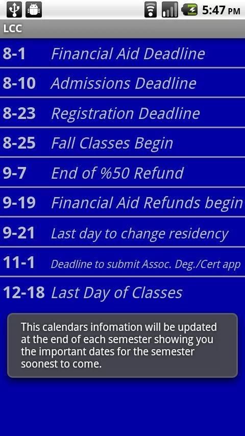 Please comment or use the feature to recommend what new features this app should have. Please understand, this is NOT an official Lansing Community College application. I am a student attending LCC for computer programming and thought this app could be useful to more people than just me, so I published it, and now maintain it...for free... lol Enjoy guys!! I also take on other LCC students to develop updates and get a little experience in Android development. Students to help me have been : *Andrew B.* This app is a great reference tool for anyone who is either attending LCC, or is in constant contact with LCC (employees, professors, etc). Ever had to search through a phone book for a number, or dig through the LCC website for info you need, on a regular basis? It gets kind of ridiculous at times. This app is great for students (trust me, I am one) showing important dates like when Financial Aid Refunds will start disbursing, first day of classes, last day to drop, stuff like that. Current Features include: ~ Telephone Number Directory <> ~ Updated Academic Calendar ~ Class Location Key Dont forget to check out my other applications, including an advanced Tool Box utility application that will also be a donation to the development of all future and existing applications (including this one). SEO:simple, easy, reliant, useful, orginization, Kamron, K, K., LCC, llc, Lansing, Community, College, Lansing Community college, contact, calendar, lcc, student, gibsons