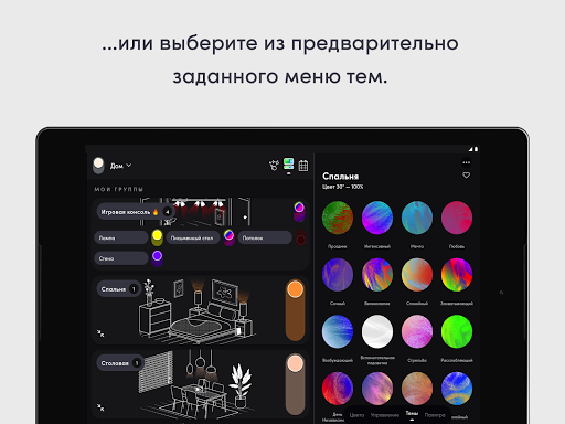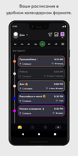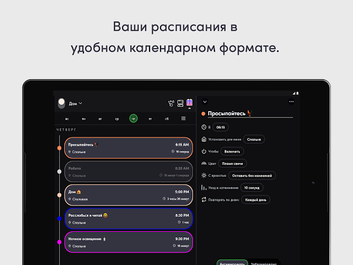 - Расписания: автоматизируйте функционирование вашего освещения: снижение насыщенности цвета, изменение цвета, а также включение/выключение, все это отображается в удобном календарном формате.