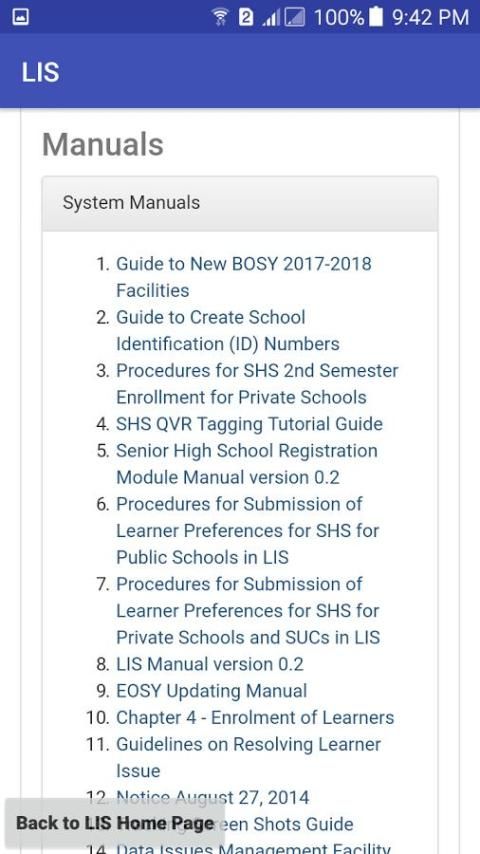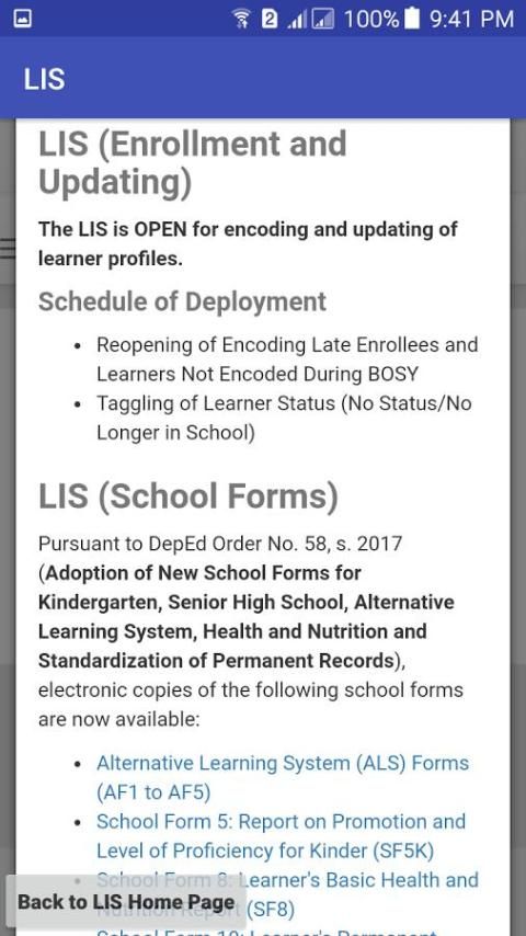 LIS является инновационным инструментом, который Департамент использует для управления информацией с целью содействия прозрачности, обоснованных решений, а также расширение прав и возможностей на различных уровнях организации. Будучи тек-решение, то LIS предполагает инклюзивное, процесс инициативе общин, который процветает из-за активного вовлечения и участия всех учителей, директоров, должностных лиц по планированию и другим персоналом DepEd все на всей территории Филиппин.