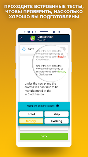 Мы добавили в приложение большой набор тестов с различными уровнями сложности, чтобы Вы могли учить английский язык, тестировать свои новые знания. После прохождения теста, приложение рассчитает уровень Ваших знаний. Это даст стимул и дальше продолжать обучение, открывая для себя всё новые горизонты.