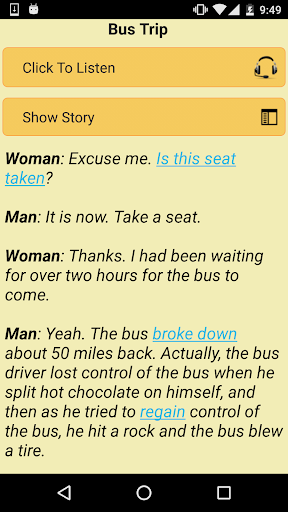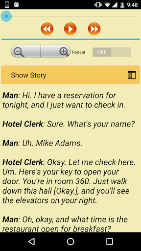 Огромное количество различных разговоров. В каждой теме существует множество подтем, и в каждой подтеме по несколько примеров похожих разговоров. Отлично что есть зацикливание. Но некоторые разговоры не загружаются, а некоторые загружаются наполовину. Жаль что нет навигации по фразам и нет подсвечивания отдельных фраз. Главное преимущество этого приложения на мой взгляд в том, что разговоры здесь более естественные и жизненные, чем в большинстве подобных программ.