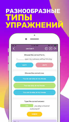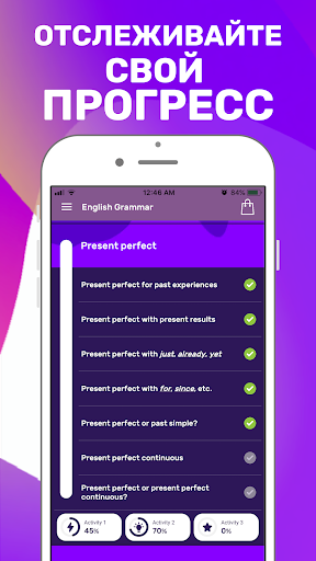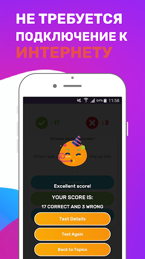 • Это языковое приложение предлагает 20 единиц грамматики английского языка в каждом тесте.