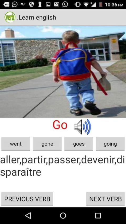 Используя изображение и звук, обучающийся будет в состоянии помнить глагол слово очень легко. Существует также примеры предложений для каждого глагола. Малыш и студент будет выгоду от этого легкого приложения весело обучения.