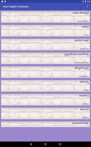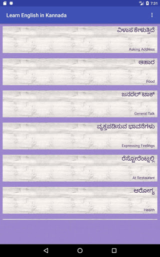 Learn English in Kannada application is designed to make learning English in Kannada in easy way. Learn English in Kannada application focus on daily used conversation and words on following topics such as