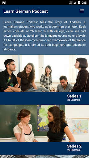 Learn German Podcast tells the story of Andreas, a journalism student who works as a doorman at a hotel. Each series consists of 26 lessons with dialogs, exercises and downloadable audio clips. The language course covers levels A1 to B1 of the Common European Framework of Reference for Languages. It is aimed at both beginners and advanced students.