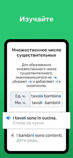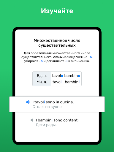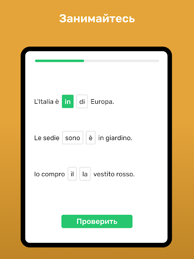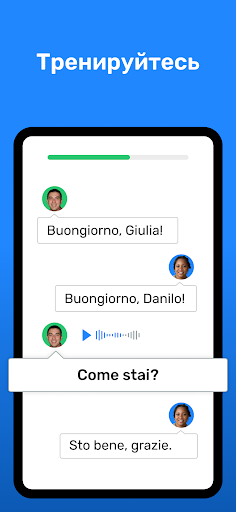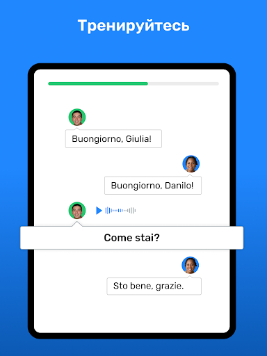 Это приложение прекрасно подойдет вам вне зависимости от вашего уровня итальянского: начального или среднего. Благодаря нашему онлайн-курсу итальянского языка вы очень быстро почувствуете прогресс в изучении итальянского. Миллионы пользователей уже занимаются на наших курсах. Хотите к ним присоединиться?