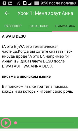 - Изучение японской грамматики. Каждый урок имеет некоторые грамматические правила.