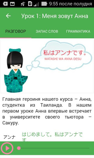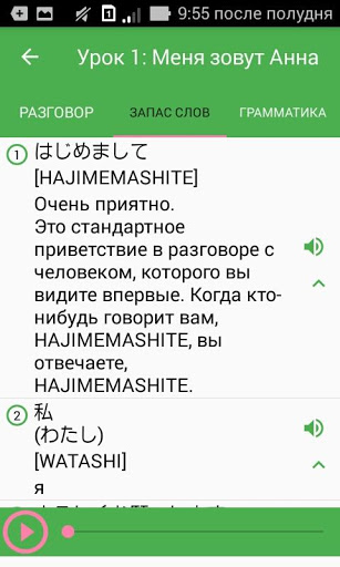 - Изучите японский язык легко с помощью аудио-уроков. Эта функция требуется подключение к Интернету, но вы можете узнать японскую связь Fastly.