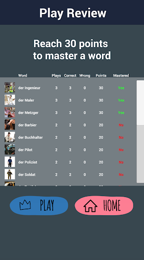 Использование включенной тестовой игры, вы можете измерить то, что вы узнали до сих пор.Используя наш метод, вспоминая новые слова навсегда возможны.
