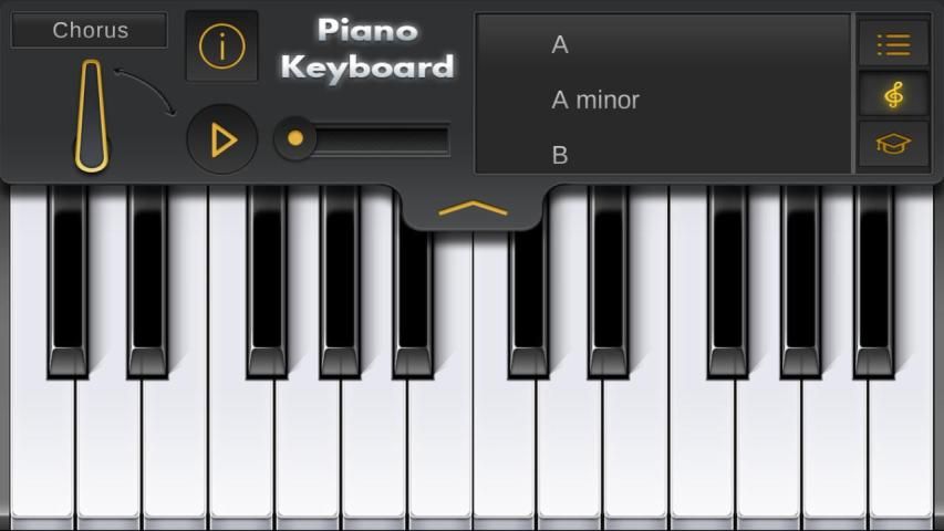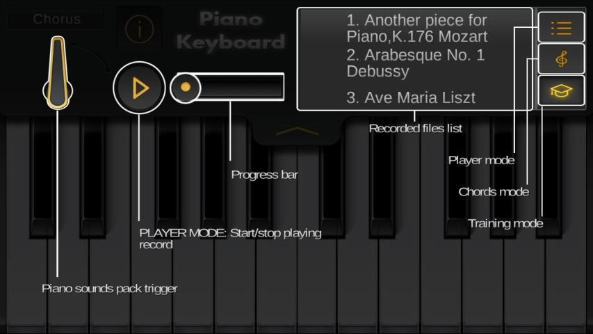 Как использовать: в данном приложении существует несколько режимов: свободный - абсолютная импровизация (очень удобен для оттаивания уже полученных навыков игры); режим изучения аккордов - подходит для изучения основ игры на пианино (полезные и простые уроки); тренировочный - в этом режиме вы можете узнать, как играются наиболее известные произведения. Для записи своей игры - нажмите кнопку "MIC".