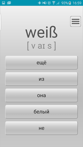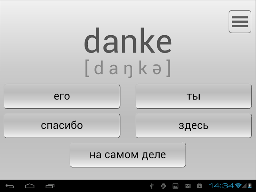 - принцип работы приложения: программа вразброс показывает немецкие слова (под словом размещена транскрипция, которая поможет правильно произнести слово) и предлагает варианты перевода на русский (английский) язык. Каждое немецкое слово программа выдает до тех пор, пока вы не выучите его. Приложение считает слово усвоенным, если вы правильно перевели его 5 раз подряд. Затем программа изымает из показов выученное слово.