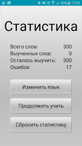 - в меню приложения находится статистика, в которой отражено, сколько всего слов выучено, сколько слов необходимо выучить, сколько ошибок допущено при изучении немецкого языка. В любой момент вы сможете сбросить данные статистики, а также изменить ваш родной язык или вернуться к изучению немецкого языка.
