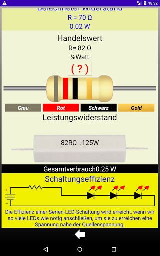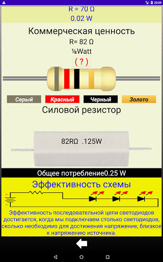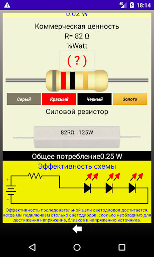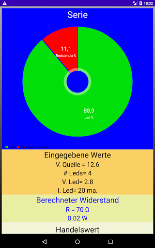 Мы добавили круговую диаграмму, показывающую эффективность схемы, красная зона показывает потребление энергии в резисторе, зеленая зона показывает энергию, потребляемую светодиодом. Действительно рассчитайте сопротивление для ваших светодиодов последовательно или параллельно, просто введите в поля значения напряжения источника, количество светодиодов, напряжение светодиода, ток светодиода, нажмите вычислить, и вы сразу увидите результат, Если вы хотите увидеть дополнительную информацию, нажмите кнопку , после чего вы увидите детали схемы, такие как круговая диаграмма, расчетное сопротивление, коммерческая стоимость, цвета полос, требуемая мощность и общее потребление цепи.