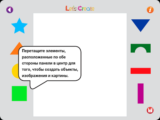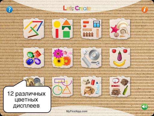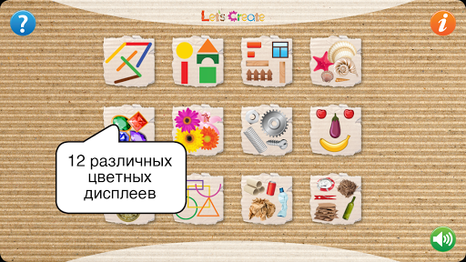 КАК ИГРАТЬ: Каждая игровая панель представляет собой разные фигуры и материалы для того, чтобы создать множество разных изображений. Перетащите элементы, расположенные по обе стороны панели в центр для того, чтобы создать объекты, изображения и картины.