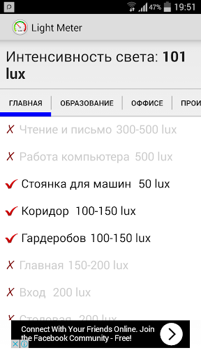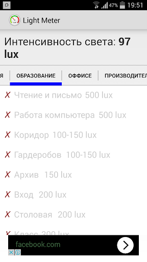 Light Meter это приложение, которое обеспечивает рекомендуемый диапазон интенсивности света для различных видов деятельности / сред и проверить, если текущий свет подходит для которых деятельность / сред. Это способствует защитить ваше зрение!