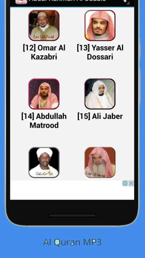 Абдул Рахман Alsudaes, Абдул Басит Абдул Самад, Абдур Рашид суфий Ахмед Аль Аджми, Абдулазиз Аль-Ахмад Абдул Wadood Ханиф, Абдолбари Ath Thubaity, Abdulmohsin Аль Obaikhan, Али Alhuthaifi, Абдулла Basfer, Ахмад аль Hawashy, Ахмед Saber, Абдулла Хайят, Al Кари Ясен, Aleyoon Alkoshi, Абу Бейкер Shatri, Али Джабер, Abdulmohsen Alqasim, Имад Зухайр Hafth, Фарес Abbaf, Хани Arrifai, Ибрагим Alakhdar, Джамал шейкер Абдулла, Халид Abdulkhafi, Халид Alqahtani, Халифа Аль Tonaeijy Махмуд Халиль, Мухаммед Аль Tablawi, Махмуд Аль Sheimy, Мишари Аль Afasy, Мустафа Исмаил, Мустафа Аль Lahoni, Махмуд Али Албана, Мухаммед Айюб, Махер Аль Muaiqly, Мохаммед Аль Minshawi, Мухаммед Джибриль, Мохаммед Аль Muhasny, Мохаммед Сиддик аль Minshawl Мохаммад Аль-Абдулла, Мустафа Раад Аль Azawi Набиль Ар-Рифаи, Saudd Аль Shuraim, Shirazad Тахер, Салах Alhashim, Салах Bukatir, Салах Аль Budair Саад Аль Гамди Сауд Аль Shuraim, Sahl Yaaseen, Awfeeq Как Sayegh, Яссер Аль Mazroyee, Яхья Хава и Заки Daghistani.