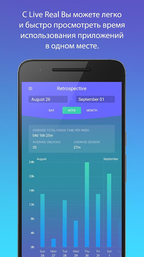 Каждая сессия, как и время использования каждого приложения, автоматически регистрируется. С помощью дашборда Live Real Вы можете легко просмотреть все текущие активные приложения в одном удобном месте. Вы также можете просмотреть все свои недавние активности, чтобы быстро увидеть, какие приложения Вы использовали и какие страницы Вы просматривали. Live Real легко настраивается под Ваши задачи, поэтому вам доступна и детальная статистика по каждому приложению на вашем телефоне. Вы можете увидеть подробные данные за любой период времени с момента установки приложения.