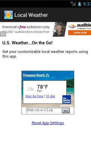 Это приложение будет отображать местные погодные условия в США. Существуют различные варианты, которые вы выбираете, чтобы настроить внешний вид отчета вашей погоде, а также. ПРИМЕЧАНИЕ: Вы должны выбрать из различных вариантов для того, чтобы отчет погода для отображения.