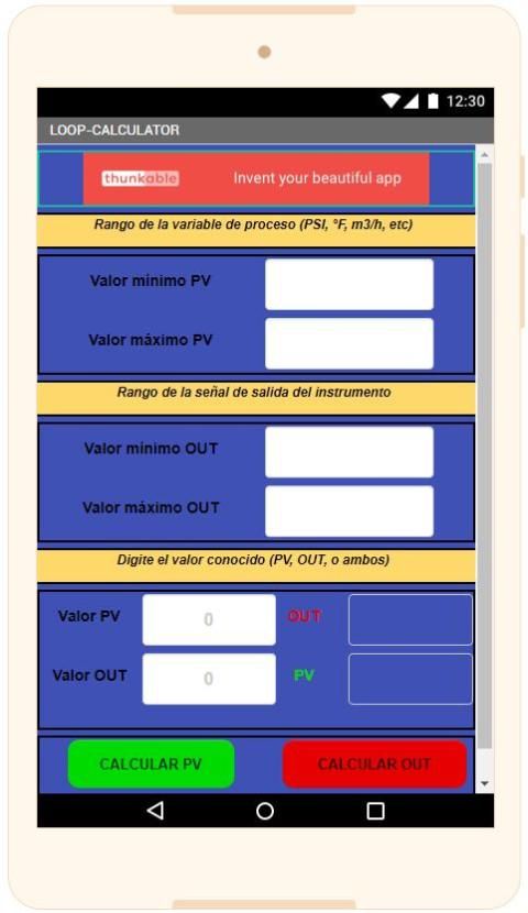 LoopCalculator is an application developed by MARROQUIN ENGINEER that allows to calculate the values ​​of the process variable and the values ​​of the output signal of a field instrument. Enter the values ​​of the PV ranges and the OUT signal (mA, mV, V, ohm,%, etc), then the known value (PV, OUT, or both) and press the corresponding CALCULATE button. This way you will obtain the required value.