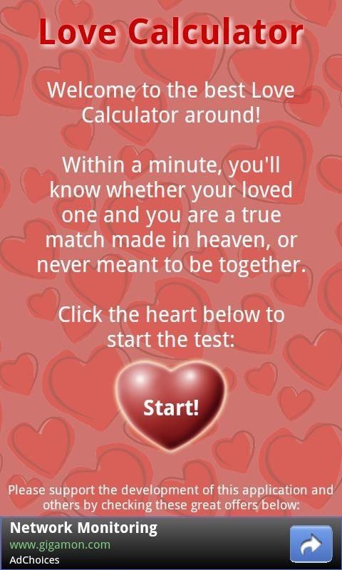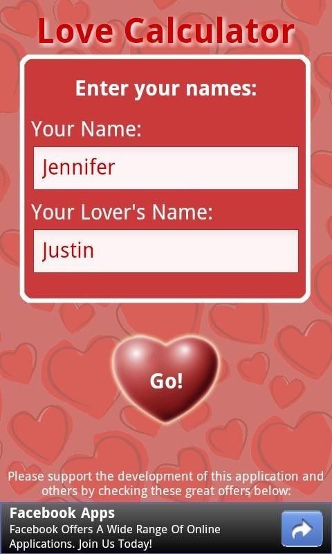 *** NEW! Easily share the results as a beautiful image on Facebook and other social networks, or send by email! Simply click the heart when the score is fully calculated! *** Check how you and your lover match, quickly and accurately using this application. Just enter your and your lover's name in the boxes, click 'Go', and you'll see exactly if you're meant to be together! Note: this application is for fun purposes only. :)