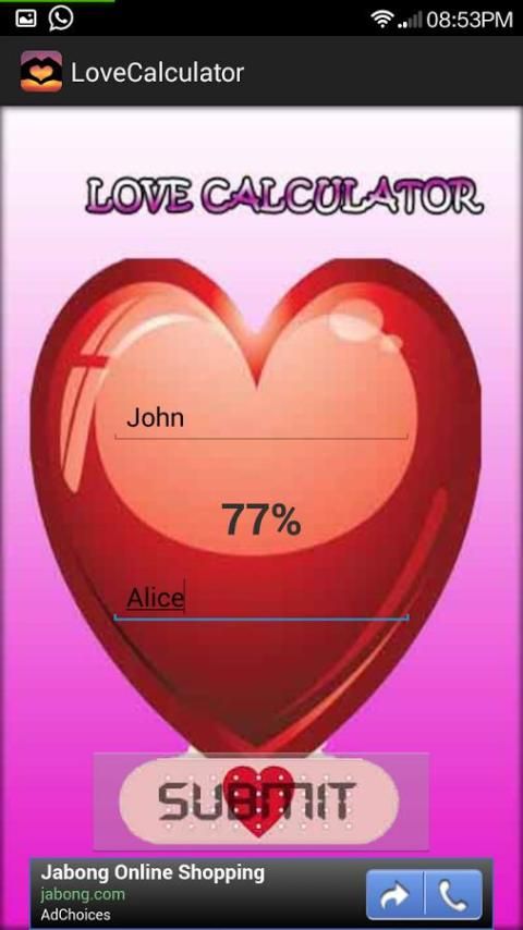 Простой Fun App высчитать Любовь Процент между двумя людьми.