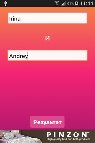 Помните, что каждый день есть другой результат, потому что есть несколько параметров, которые могут изменить результат, как фазы Луны и так далее. Ваша заявка рассчитывает ваш ежедневный совместимости с человеком, по вашему выбору.