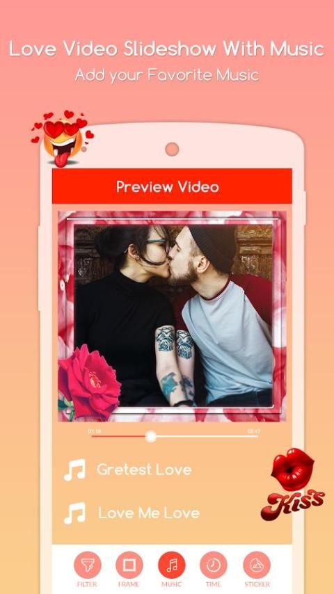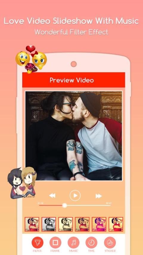 Вы можете создавать видео с помощью любви фотографии, добавить музыку в видео, редактировать фотографии, используемые для видео, добавить Любовь кадров видео, смешайте Любовь анимированных видео тему с видео и объединить Любовь песню с видео.