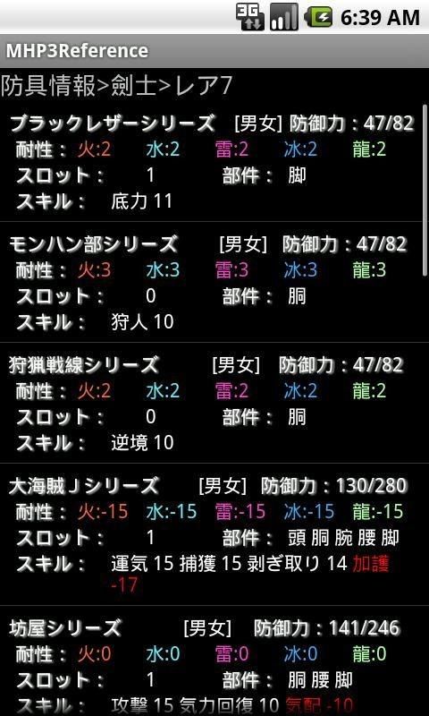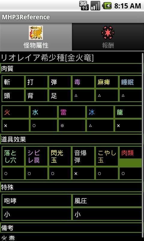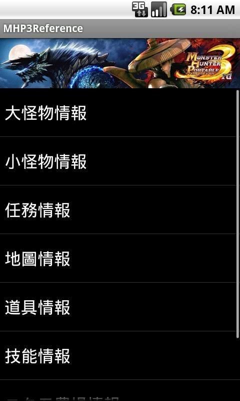 這是一個為玩Monster Hunter Portable 3獵人而設的, 方便大家在CAFE,快餐店裡斬龍時提供一些資料。 不用帶字典般攻略四周走。 功能: 1. 查看怪物資料 2. 查看任務資料 3. 查看地圖資料 4. 商店,調合及山菜爺的物品資料 5. 查看防具資料, 按下生產素材的名稱可查閱出處 6. 查看農場情報 7. 查看技能情報 8. 武器使用手册 9. 道具搜尋,道具情報MENU裡面 10. "本程式介面" (繁中,簡中,日語,English) 11. "遊戲語言",可讓玩家選手相對的PSP MHP3語言版本 ***如何使用<<武器資料>>功能: 1. 在主目錄,選擇武器資料 2. 選擇武器種類 3. 在搜索畫面中,選擇你所找尋的武器屬性,然後按搜索 4. 畫面會出現搜索結果,列出武器的最終屬性。 5. 選擇目標武器 6. 武器生產流程就會出現。 如有什麼意見請留言,程式會不斷改進。