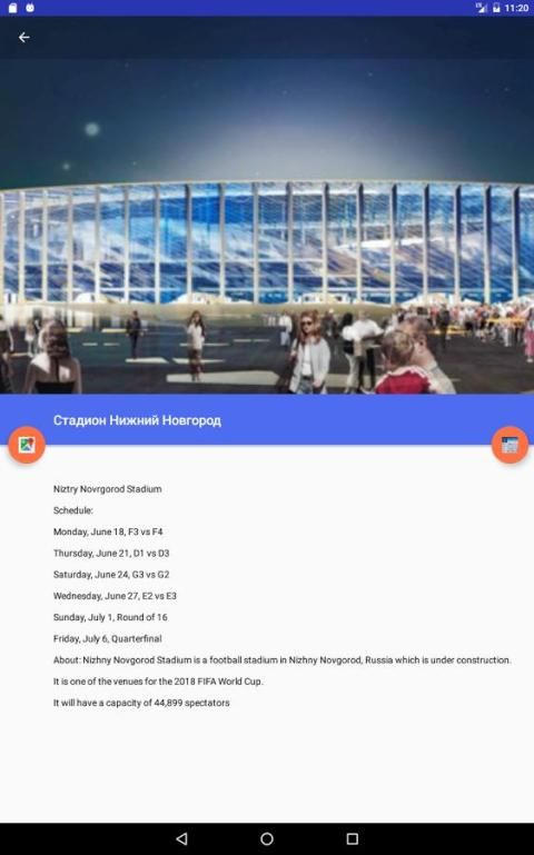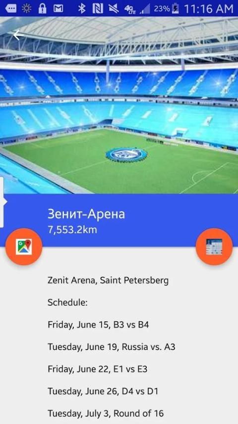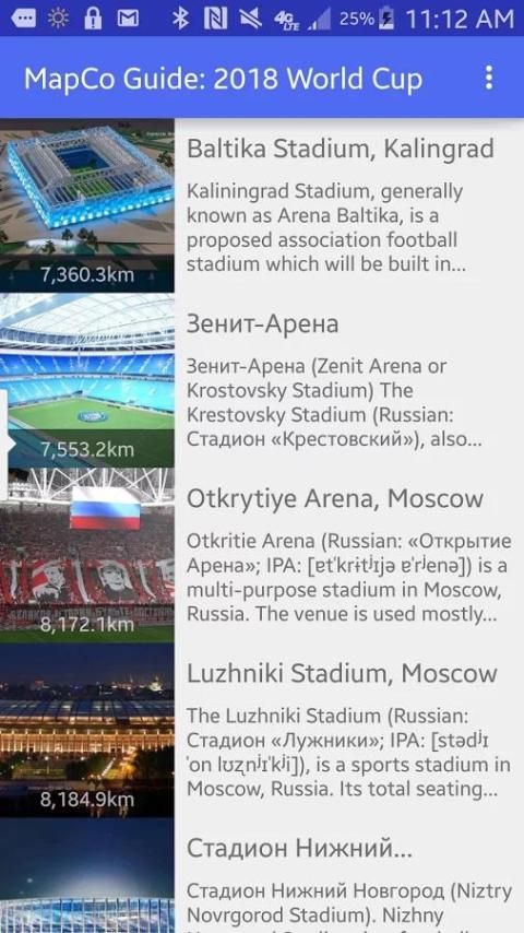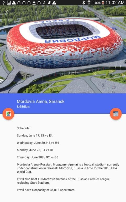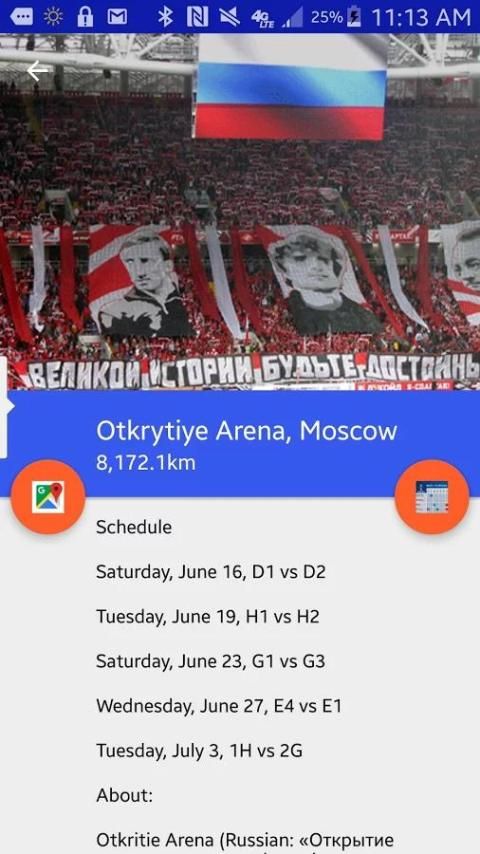 Она показывает относительное местоположение пользователей ко всем играм, отсортированный от ближайшей к самой дальней, а затем предоставляет подробную информацию обо всех играх происходящих на стадионе в вопросе. На стадионы, где будут играться игры будут по всей России (хотя они выбрали места ближе к Европе).
