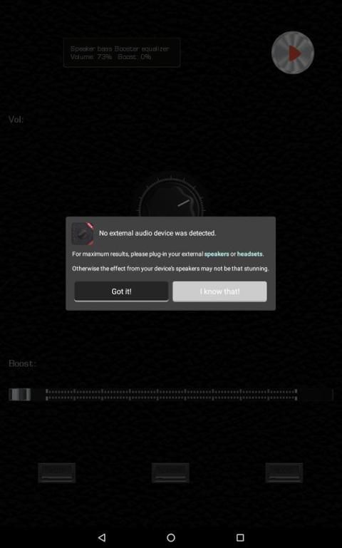 Что отличает Speaker Bass Booster Эквалайзер от других подобных приложений является то, что, когда пользователь активирует увеличить это приложение не только усиливает звук до конца, но и использует встроенный в Android эквалайзер для оптимизации частотных каналов с помощью специального алгоритма. Таким образом, результатом является более сильным и более ясным увеличил звук.