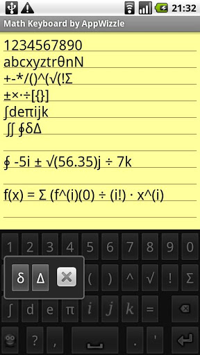 A useful math keyboard for use with the AnySoftKeyboard Keyboard replacement.A Math Keyboard for use with the AnySoftKeyboard Keyboard replacement.To use this keyboard, you need to have AnySoftKeyboard installed. Install AnySoftKeyboard first, then select the Math Keyboard from AnySoftKeyboard39;s Settingsgt;Keyboards menu.Got a bug? email the devv2.0 Added infinity symbol as per user request.