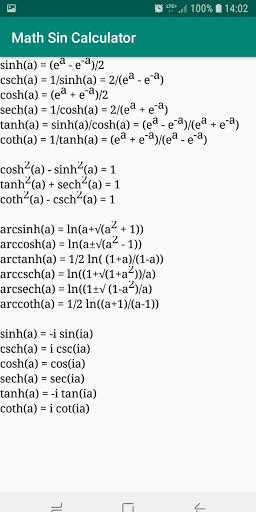 This calculator calculates (and solves equations!) of all trigonometric functions such as sin, cos, tan and cotan. It also calculates asin, acos, atan, acotan, tanh, cotanh, sinh, cosinh, sech and csch. There are also a lot of trigonometric and hyperbolic laws included in the calculator.