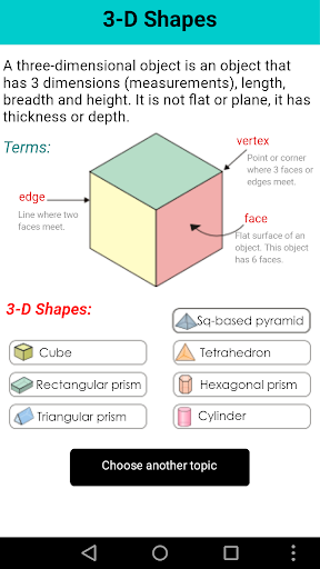 The app covers much of the Geometry aspects of the South African Mathematics Grade 7 syllabus as laid out in the CAPS Document. The concepts have the following associated with it: