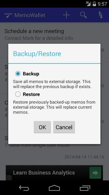 MemoWallet не требует никаких сетевых подключений для хранения заметок. Это просто сохранить памятки в хранении внутреннего устройства и обеспечивает резервное копирование в & восстановить из внешней памяти (SD карты).