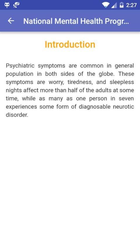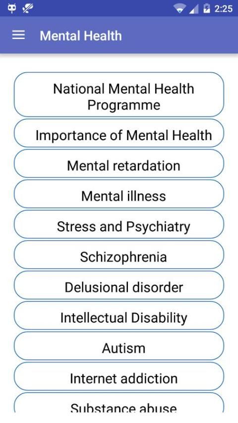 Психические приложение Health предоставляет подробную информацию о Национальной программе психического здоровья, важности психического здоровья, умственная отсталость, психические заболевания, стресс и психиатрии, шизофрения, бредовые расстройства, интеллектуальной инвалидности, аутизм, Интернет-зависимость, токсикомании и т.д.