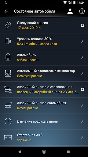 • Инофрмация о состоянии автомобиля (например, пробег, давление в шинах, уровень топлива и запас хода, дата следующего техничееского обслуживания и т. д.)
