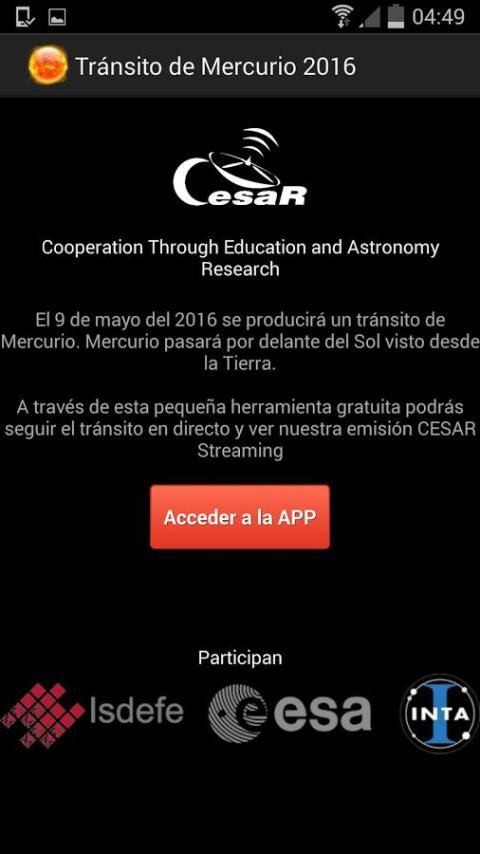 Sencilla herramienta para ver el Sol en directo durante las observaciones previas al tránsito y durante el tránsito de Mercurio que tendrá lugar el 9 de mayo del 2016. Además podrás acceder a un streaming en directo con la Agencia Espacial Europea donde nos contarán las últimas misiones de la ESA, información sobre el proyecto educativo CESAR y la estación en España de la agencia ESAC.